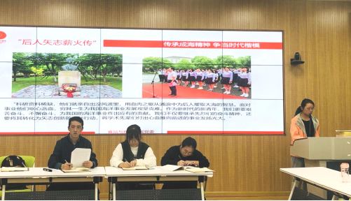 会上朱江婷同学介绍自己的感悟,王成海出色的学习能力,无畏的牺牲精神成为了海大“海纳百川,自强不息”的校训的杰出实践者。号召全体党员深入学校王成海烈士身上体现的热爱祖国、献身事业的爱国精神,勤奋好学、求真务实的学术精神和勇于拼搏、艰苦奋斗的海洋精神。